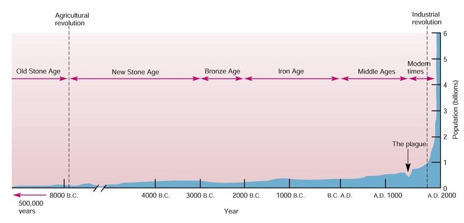 It is estimated that from the beginning of modern human existence to the Agricultural Revolution, the human population increased to approximately 10 million in 200.000 years. After the invention of agriculture, the increasing trend of human population became exponential and the population of our species reached 250 million in only 12.000 years, till the birth of Christ. But this was just the tip of the iceberg (Figure-1). With the help of the usage of steam engines and electricity (mass production) and following industrial revolutions (digital and cyber) our density on earth made an enormous jump from 1 billion (in 1800s) to 7.7 billion in 2019 in only 2 centuries [2].
