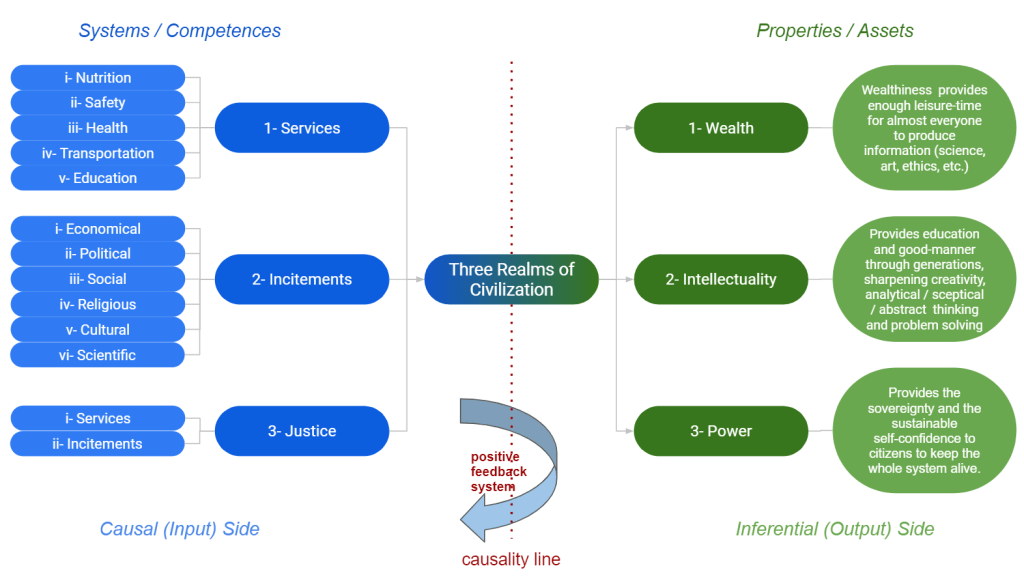 In summary, having a system including ‘Three Pillars’ of the causal-side of the civilization cycle will cover the first three stages (physical, safety, belongingness) of the ‘Maslow’s Hierarchy of Needs’ pyramid and make us ready to jump the right side of the ‘Figure-2’, inferential-side, which is covering the last two stages of the pyramid, Self-Esteem and Self-Actualization.